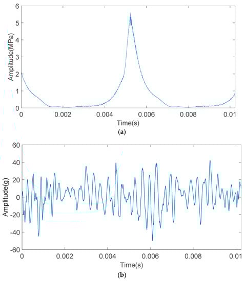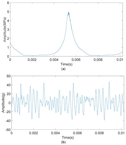 Time-domain waveform of the cylinder pressure signal and the engine block vibration signal under a weak knock condition at 5100 rpm. (a) Time-domain waveform of the cylinder pressure signal under a weak knock condition at 5100 rpm. (b) Time-domain waveform of the engine block vibration signal under weak knock condition at 5100 rpm.
