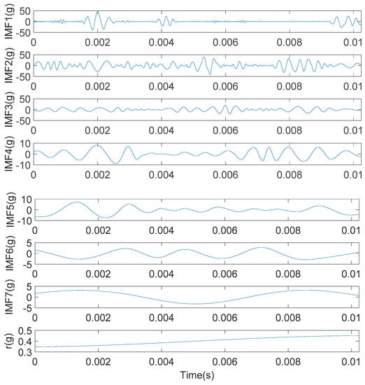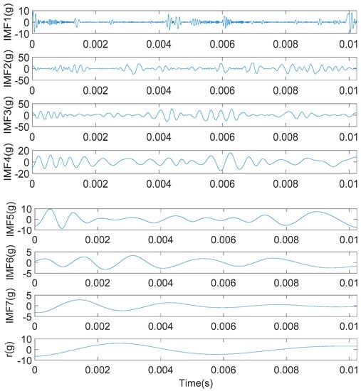 Using the IMFE method, the engine block vibration signal in Figure 15b is decomposed, and seven IMF components and one residual component are obtained, as shown in Figure 16. The orthogonality test of the IMF component is conducted, and the value is 0.1456% (<1.0%).