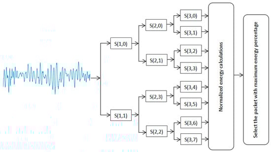 To verify the effectiveness of the IMFE method, Wavelet Packet Energy method was used to identify the weak knock characteristics from the engine block vibration signal at 5200 rpm, as shown in Figure 15b. A Wavelet Packet Energy method decomposes the engine block vibration signal into a library of orthonormal bases organized in a binary tree structure []. Then, the normalized energies of the packets at level 3 are calculated. Figure 19 illustrates the generalized block diagram of the proposed approach.