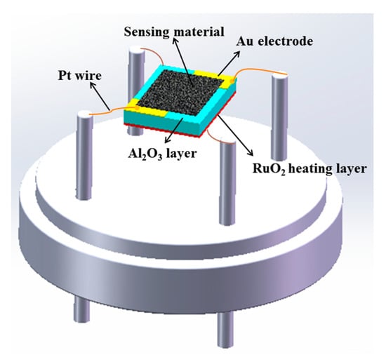 The SnO2 powder materials were dispersed in ethanol to form a colloid, and the colloid was then coated on an alumina chip (area = 1.0 × 1.5 mm, thickness = 0.2 mm). The sensor chip, as-shown in Figure 1, was designed with 4 electrodes: two electrodes for heating and two electrodes for detection. The heating and probing electrode was electrically separated by a thin insulating SiO2 film. The sensor component was then wire bonded with a standard Transistor Out-line (TO) package. The heating temperature was adjusted from 109 to 240 °C. The gas sensing properties were measured by an Integrated Gas Sensing Test System (LW-GS-002, Anhui Six-dimension Sensor Technology, Ltd.) with two mass flow meters (MFs) to control the acetone gas concentration (50 ppb−2 ppm), and high purity air was used as the diluent and carrier gas. Different concentrations of acetone gas (from 10 ppm to 1000 ppm) were injected into the test chamber (25 mL in volume) through a rubber plug by a microinjector to form an acetone vapor. The saturated target gas was mixed with air (where the relative humidity of 35% was measured at 25 °C) by natural diffusion. The resistance of the materials was measured and collected in real-time with a time step size of one second. The gas sensing response is defined as the ratio (S = Ra/Rg) of the resistance of the sensor in air (Ra) to that under an exposure to the target gases (Rg). The response and recovery times are defined as the time taken by the sensor to achieve 90% of the total resistance change in either the atmospheric air or target gases. Note that the changes in the sensor response times are recorded for the gas concentrations, ranging from zero to the set concentration. The changing response times actually depends not only on the performance of the sensor but also on the test equipment. Thus, all the response and recovery times obtained in the real-time measurements are only meant as references.