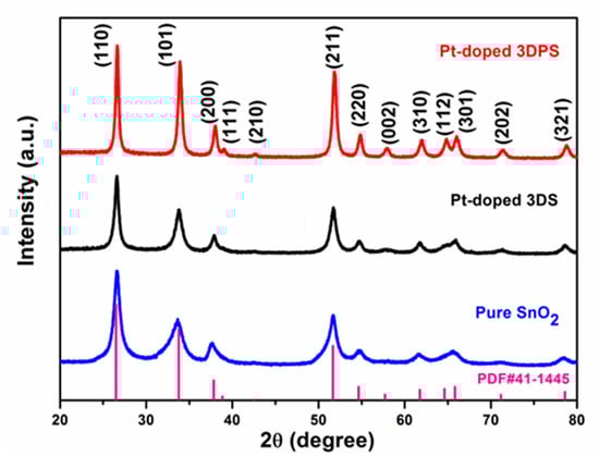The structure of the synthesized pure SnO2, Pt-doped 3DS and Pt-doped 3DPS samples, as shown in Figure 2, were characterized by XRD. The results of the diffraction peaks in the 2θ range from 20° to 80° verified that all three of the prepared samples are standard tetragonal rutile crystal phases of SnO2 (JCPDS file No. 41-1445, a, b = 0.474 nm and c = 0.319 nm), indicating that Pt doping and high-temperature post-annealing does not affect the hierarchical structure. For the calcined Pt-doped 3DPS sample, the sharpness of the peaks suggested an improved crystallinity. No obvious diffraction peaks corresponding to Pt were observed, since the Pt particles were too small or too highly dispersed to be detected.