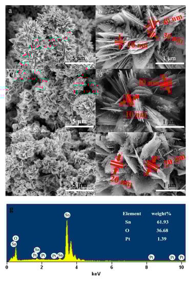 The morphologies of the three hydrothermally synthesized samples, as shown in Figure 3, were observed by SEM, where the images on the left and right of Figure 3 are the low and high magnification images, respectively. The low magnification SEM image in Figure 3a,c,e shows the general morphology of all three products, in which a 3D hierarchical nanostructure can be observed and is composed of numerous flower-like microstructures with diameters of 2–4 μm. These flowers are self-assembled by many uniform 2D nanosheets that assemble at the flower centers and extend toward different directions. The high magnification SEM image in Figure 3b,d,f clearly demonstrates that the nanosheets have a thickness of approximately 10–40 nm. From Figure 3f, after calcining with the Pt dopant, it is obvious that the microstructure contains many voids and interspaces among the petals to form a unique low density and porous 3D structure, and these voids and interspaces not only provide an excellent channel for the transport of detected gases but also serve as reaction centers for the target gas. The thermal decomposition of the organic impurity (salicylic acid) and the release of gas into the confined space during the sintered process have resulted in the formation of the porous structure. As evidenced by Figure 3d, a smooth surface was observed for the sample prepared without calcining. Thus, the calcination process is a key factor for the formation of pores. Figure 3g also shows the corresponding EDX spectra of Pt-doped 3DPS. Only peaks corresponding to Pt, Sn and O elements were observed, suggesting that Pt was successfully doped in the sample and high purity samples were obtained. The amount of Pt doping is estimated to be 1 wt % from the weight ratios of Pt to Sn.