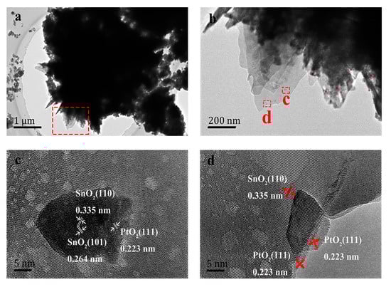 To analyze the fine microstructure of the Pt-doped 3DPS sample in nanoscale, TEM and high-resolution TEM (HRTEM) characterizations were utilized. The low-magnification TEM images, as shown in Figure 4a,b exhibited that the size of Pt-doped 3DPS was several micrometers, and the morphology of the sample was similar to that determined by the SEM observations. Pores with irregular shapes can also be seen in the nanosheet, as shown in Figure 4b, which is potentially beneficial for gas diffusion and the transport of gas molecules in the sensors. As seen from the magenta area in Figure 4b, PtO2 was uniformly dispersed on 3DPS. To further observe the SnO2 3D microstructure and distribution of Pt and PtO2 nanoparticles in the Pt-doped 3DPS microstructure, HRTEM was used. The HRTEM images, as shown in Figure 4c,d revealed that SnO2 had a single crystal structure; the d-spacings were determined to be 0.335 nm and 0.264 nm, which agreed well with the d-spacing of the (110) and (101) planes of the tetragonal cassiterite structure of SnO2. The distance between the adjacent lattice planes is estimated to be 0.223 nm, which corresponds to the distinct PtO2 (111) lattice fringes shown in Figure 4c,d and demonstrates the coexistence of Pt. According to the size distribution diagram (Figure S1), the average size of nanoparticles is estimated to be about 8.7 nm. Post-annealing promotes the formation of metallic clusters, which improve the homogeneity of their distribution across the layer thickness and stabilize the solid-phase of the Pt-doped 3DPS material. However, increasing the annealing temperature further may result in the agglomeration of Pt and PtO, reducing the activity of the material and ultimately reducing the sensitivity of the sensor.