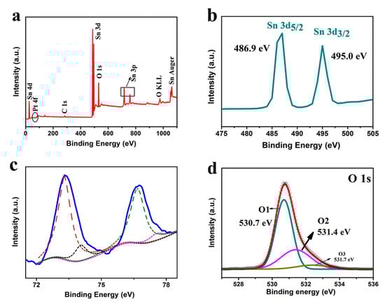 To investigate the chemical state of the elements and chemical composition of the materials, XPS analysis was performed, and the results are shown in Figure 5. Figure 5a shows the high-resolution XPS analysis for the full range of the spectrum. The peaks corresponding to Sn, Pt and O, as well as C, can be clearly observed in the survey spectrum. The C 1s binding energy of 284.7 eV was used as the reference for calibration. The weak C peak is most likely due to surface contamination that occurred during sample handling and storage. One unidentified peak at 1062 eV may be attributed to the Auger transitions. The binding energies correspond to different energy levels of O, Sn and C and are summarized in Figure 5a. There are distinct peaks corresponding to Sn (4d), Sn (3d), Sn (3p), O (1s) and Pt (4f). Figure 5b presents the XPS spectrum of Sn 3d. Two strong peaks centered at 486.9 and 495.0 eV can be identified as the bonding energies of Sn 3d5/2 and Sn 3d3/2, respectively, which are attributed to the spin-orbit coupling of the 3d state with the 8.1 eV spin-orbit separation. The result is well-match with the standard data of SnO2, proving that Sn4+ is present in SnO2 []. Note that the intensity of the Pt 4f peaks in Figure 5a are almost too low to observe in the full range of the spectrum because of the low concentration of Pt. The Pt 4f (Figure 5c) signals display two pairs of doublets, indicating the presence of two oxidation states. The most intense doublet with binding energy of 73.3 eV (Pt 4f7/2) and 76.6 eV (Pt 4f5/2) is attributed to Pt2+ as in PtO. The second doublet found at 74.1 and 77.6 eV appears to be Pt4+, possibly as PtO2 [,,]. In contrast, metallic Pt peaks (70-71 eV) were not detected in the crystal structure of Pt-doped 3DPS in Figure 5c []. Three peaks at 530.7, 531.4 and 531.7 eV were observed the asymmetric O 1s spectrum, as exhibited in Figure 5d, and can be ascribed to the oxygen species in Pt-doped 3DPS. The lowest binding energy of 530.7 eV corresponds to the SnO2 lattice oxygen, whereas the medium binding energy of 531.4 eV is due to the O2− ions in the oxygen vacancy regions. Additionally, the high binding energy located at 531.7 eV could be attributed to the presence of oxygen ions chemisorbed on the SnO2 surface. All the above-mentioned qualitative XPS results confirmed that the Pt dopants were incorporated into the Pt-doped 3DPS material. XPS shows a Pt concentration of 0.21%.