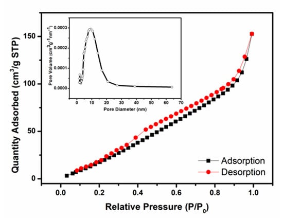To further obtain information about the specific surface area, pore size and pore distribution of the Pt-doped 3DPS microstructure, the nitrogen adsorption and desorption measurements were performed at 77 K. The results of the N2 adsorption-desorption isotherm and the corresponding pore-size distribution (PSD) curves of the Pt-doped 3DPS microstructure are shown in Figure 6. The specific surface areas were measured by the Brunauer–Emmett–Teller (BET) method, and the PSDs were calculated from the adsorption branches using the Barrett-Joyner-Halenda (BJH) formula. According to the IUPAC classification, the isotherm obtained for the Pt-doped 3DPS sample can be approximately classified as a type IV isotherm with a type H3 hysteresis loop, indicating the existence of slit-like pores in the materials that formed by the aggregation of sheet-like particles []. The presence of highly mesoporous (pores 2–50 nm diameter) structures is suggested by the prominent hysteresis loops obtained at relative pressures from 0.45 to 1.0. Using the BJH method and the adsorption branch of the nitrogen isotherm, the calculated PSD indicated that the material contained pores with average sizes of 10 nm, which agreed with the observations obtained from the TEM and SEM images. The BET surface area of the products was calculated to be 156.72 m2 g−1. As shown in Figure S2, the pure SnO2 and Pt-doped 3DS samples possess specific surface areas of 78.29 and 129.30 m2 g−1, respectively. The insets of graphs show the pore size of the two samples. No peak was observed in the pore size distribution curves of pure SnO2 and Pt-doped 3DS samples. The excellent properties, including the high specific surface area and appropriate pore size distribution, makes the Pt-doped 3DPS material a promising candidate for improving the performance of gas sensors.