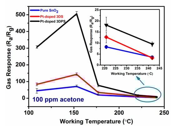 It is well-known that the response of a semiconductor gas sensor is considerably affected by the working temperature due to significant influence of temperature on all aspects of gas sensing processes, including the gas adsorption/desorption, diffusion and reactions processes. The optimal working temperature of a gas sensor is defined as the temperature corresponding to the maximum response. To explore the influence of temperature, the gas sensing responses of the abovementioned three sensors were characterized at operating temperatures in the range of 109 to 240 °C with 100 ppm acetone. Lower temperatures were not tested in this experiment due to limited electrical power. The electrical power needed to heat the sensor to 109 °C is approximately 45 mW, which satisfied the power requirement for almost all portable devices. The gas sensing performances of the three samples to detect 100 ppm acetone, as shown in Figure 7, exhibit a similar trend. The responses of all the sensors first increased with operating temperature, achieving a maximum value at 153 °C, and then gradually decreased by further increasing the heating temperature. Obviously, 153 °C is the optimum working temperature from the tested temperature values for all three samples, and the highest gas response to 100 ppm acetone is estimated to be 70.9, 143.1 and 505.7 at 153 °C for pure SnO2, Pt-doped 3DS and Pt-doped 3DPS respectively. The Pt-doped 3DPS sensor exhibits the highest response to 100 ppm acetone for temperatures less than 153 °C, and this response is over seven times higher than the response of the pure SnO2 sensor. The mechanism explaining the optimal temperature for the maximum sensing response is complex []. Mainly, this mechanism may be related to the competitive effect of the temperature on the absorption, desorption, reaction and diffusion processes. These details will be discussed later.