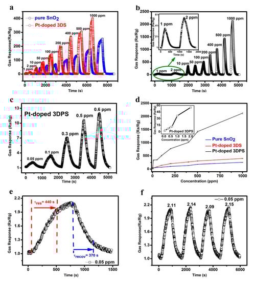 To explore the measured gas concentration limit of the gas sensor at the optimum temperature, the sensing responses of the sensors were measured for different acetone concentrations from 1 ppm to 1000 ppm for the three samples: pure SnO2, Pt-doped 3DS and Pt-doped 3DPS. Figure 8a,b clearly shows that the gas responses increased monotonically with an increase in the concentration of acetone gas. Because acetone is a reducing gas, the sensor is an n-type semiconductor material, and the resistance of the sensor is reduced when the gas is introduced and returns to the initial value after the introduction of acetone is stopped or fresh air is introduced. The largest response to a 100 ppm acetone concentration was exhibited by the Pt-doped 3DPS material and was approximately seven times higher than the response of the pure SnO2 sensor at the same acetone concentration and at an operating temperature of 153 °C. Since measuring low acetone concentrations is a requirement for the early diagnosis of diabetes, Figure 8c shows the measurement of acetone concentrations ranging from 50 ppb to 2 ppm for the Pt-doped 3DPS-based sensor. The minimum concentration was established as 50 ppb because of the limitations of our measuring equipment. A response of 2.1 was found at an acetone concentration of 50 ppb. To our limited knowledge, 50 ppb is the minimum acetone concentration recorded to date by a sensor in an environment with a temperature below 200 °C. Furthermore, as seen from Figure 8d, the Pt-doped 3DPS-based sensor possesses a wider linear range. The response of the Pt-doped 3DPS sensor linearly increases with increasing acetone concentration, while the other two sensors seem to start saturating at a concentration of up to 500 ppm. Additionally, the inset of Figure 8d shows the response of Pt-doped 3DPS, which increases sharply from 50 ppb to 2 ppm. Figure 8e shows that the response and recovery times of the Pt-doped 3DPS sensor toward 50 ppb acetone at 153 °C are 440 and 370 s, respectively. As we have previously described, the effect on the response time of a gas sensor depends not only on the performance of the sensor itself but also on the ingress and egress rates of the gas. Nonetheless, this gas response time is acceptable for the measurement of static acetone gas. Figure 8f describes the repeatability of the Pt-doped 3DPS sensor’s response to a 50 ppb concentration. One can see that after four dynamic response-recovery cycles of charging and discharging acetone gas, the sensitivity (Ra/Rg) reveals no degradation, indicating that the Pt-doped 3DPS sensor has a good stability for practical applications.