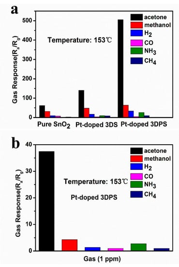 (a) Selective characterization of different sensors based on pure SnO2, Pt-doped 3DS and Pt-doped 3DPS with exposure to various gases at 153 °C; (b) Selective characterization of Pt-doped 3DPS at gases concentration of 1 ppm.