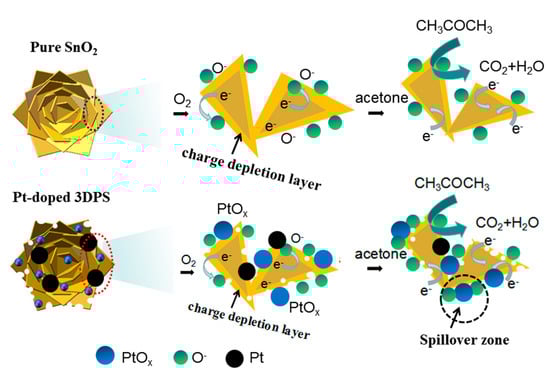 The target to doping noble metals in sensing material is to either provide more sites for more gas absorption or reduce the absorbed activate energy for readily gas absorption or reaction [,,]. As illustrated in Figure 10, since the free energy of the surface of the noble metal particles is lower than that of the metal oxide, the oxygen and the acetone molecules preferentially absorb on the metal particle but not at the metallic oxide []. During the absorption of oxygen and the acetone gas, part of Pt still remains in a metallic state in air, which provides not only catalytic adsorption sites for oxygen and acetone but also help the activated oxygen species to be ionosorbed through trapping electrons from the metal oxide [,]. Thus, the molecules can first adsorb onto the oxide support and then diffuse to a catalyst particle. This suggests that the effective capture radius of a catalyst nanoparticle can be much greater than the nanoparticle’s physical radius, consequently increasing the capture of oxygen and acetone molecular absorption and accelerating the molecular reaction [].