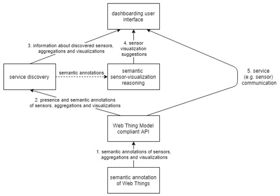 Figure 1 explains our approach on a high level, in five steps. First, a component is able to fetch or generate semantic annotations of the available Web Things, such as sensors, aggregations and visualizations. Then, a component discovers the presence and semantic annotations of these Web Things. This is achieved by crawling (walking over linked URLs) a Web Thing Model compliant API. This service discovery component is then able to send the dashboarding user interface, upon request, the list of discovered Web Things. With this, the user interface can present the sensors and aggregations that can be selected while building a new widget to be added to a dashboard. Once a user selected one or more sensors to visualize, and possibly an aggregation function to apply, a semantic reasoning component suggests appropriate visualizations for the selected sensor(s) and aggregation, given their semantic annotations, which were discovered earlier. Then, once the user selected one of the suggested visualization options, a widget will be created on the dashboard for the chosen visualization. Finally, the dashboard interface will start communicating with the Web Thing Model compliant API—it will fetch the visualization’s layout and code, load that into the created widget and start to continuously fetch the latest sensor observations, possibly process it using the aggregation service and eventually add the resulting data points to the visualization.