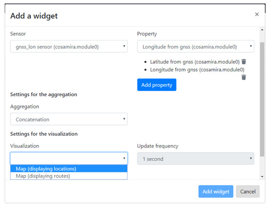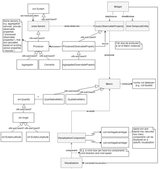 A first input to the reasoning process is the sensor property selection made by the user in the dashboarding user interface. Note that we decided to match available visualizations with a selection of sensor properties, not the sensors, nor the observations they make over time. The reason for that is twofold. The first argument is user-friendliness—a sensor can observe multiple properties, whereas a user may not want to visualize all of them on a single widget, or worse, the visualization may fail to display one or more of the properties linked to a sensor, because it was simply never built for that type of sensor property. The second argument is related to performance. An observed property will make a vast amount of observations over time. Semantifying these and reasoning on them would be nefast for the execution time. As a sensor property usually leads to observations of the same type all the time, and therefore results in the same reasoning conclusions every time, there is no need to execute the reasoning on observation level. In summary, matching visualizations are found when a sensor’s observable property produces a metric with identical characteristics (e.g., data type and metric type) as the one accepted by a visualization component. This required link in the metadata was also indicated in grey on Figure 2.