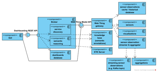 The Industry 4.0 interconnection principle [19] dictates the industry to interconnect sensors, appliances and industrial machines over the Internet of Things (IoT) and encourages to reduce the number of sensor intercommunication protocols (e.g., MQTT, CoAP) by only using standard Web protocols (e.g., HTTP over TCP/IP) and providing RESTful [15] web APIs as a uniform interface [20,21,22]. Such web-enabled sensors are often called Web Things, and the web of interconnected Web Things is then called the Web of Things. The encapsulation of a sensor in a RESTful web API means that, for example, a simple HTTP GET request suffices to retrieve one or more of the sensor’s observations. This reduces the heterogeneity of sensor protocols that an integrator application, such as a dashboard, is faced with.