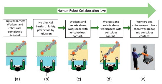 With the rapid development of robots and artificial intelligence technology, manufacturing has increasingly relied on human–robot collaborations (HRCs). In future manufacturing industries, robots and humans will collaborate in processing a product at the same workstation [1,2]. To improve the flexibility, production efficiency, and quality of this collaboration, robots must perceive the environment in real time and accordingly adapt to environmental changes [3]. HRC has been developed through five main levels as described below (see also Figure 1):