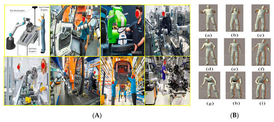 In an actual HRC environment, humans usually stand throughout the HRC process (see Figure 2A). Moreover, different standing postures correspond to different actions in the workflow. Therefore, we consider nine typical standing postures of the human body in an HRC scenario. The standing-action states are divided into nine classes, each corresponding to one posture (Figure 2): (a) right-backward standing (RBS); (b) back-incline standing (BIS); (c) left-backward standing (LBS); (d) right-leaning standing (RLS); (e) upright standing (URS); (f) left-leaning standing (LLS); (g) right-forward standing (RFS); (h) forward-leaning standing (FLS); and (i) left-forward standing (LFS).