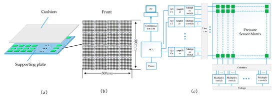 Standing-posture classification system (SPCS) framework: (a) structure of the pressure floor; (b) sensor matrix; (c) data acquisition system.