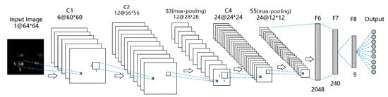 To optimize the classification results, we adopted a new optimization method that combines Adam optimization with SGD optimization. First, the Adam optimization method adaptively adjusts the learning rate until the network converges quickly. Next, the trained model with the minimal learning rate is fine-tuned by SGD. The SGD method re-optimizes convolution layer C4 and the fully connected layers (F6, F7, and F8) in Figure 4, but maintains the parameters from the input layer to pool layer S3. The initial recognition rate was set to 0.0001. The recognition rate of the final model on the test set was 96.412%.