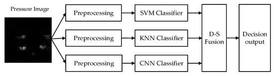 To improve the recognition results, the proposed classification algorithm fuses multi-type classifiers based on D–S evidence theory. By virtue of their high classification effect in this paper, SVM, KNN, and CNN were selected for verification. Figure 5 shows the framework of the algorithm. First, the three classifiers were trained to obtain the classifier models. The outputs with high recognition rates from the three classifiers were then fused by information-fusion technology based on the D–S evidence theory. Finally, the standing posture was selected from among the fused target information by Dempster’s combination rule.