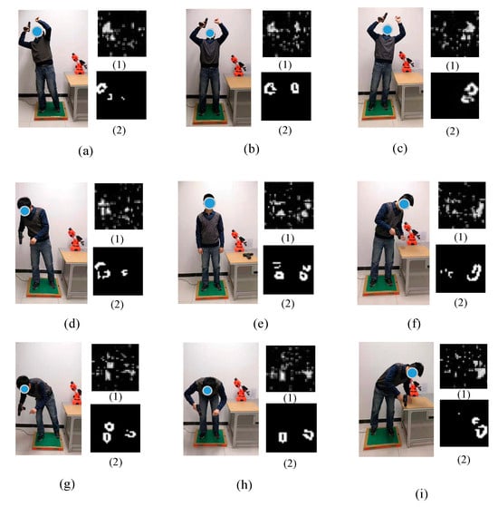 Standing postures evaluated in the experiment: (a) RBS; (b) BIS; (c) LBS; (d) RLS; (e) URS; (f) LLS; (g) RFS; (h) FLS; and (i) LFS. In each case, (1) is the original image and (2) is the image after Gaussian filtering.