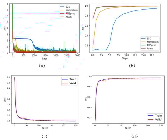 As evidenced in Figure 6a,b, the Adam algorithm was more effective than the other optimization methods. Referring to the literature [43], the recognition rate of Adam tends to stabilize after approximately 10 epochs. The recognition rate on the test set was 96.16%.