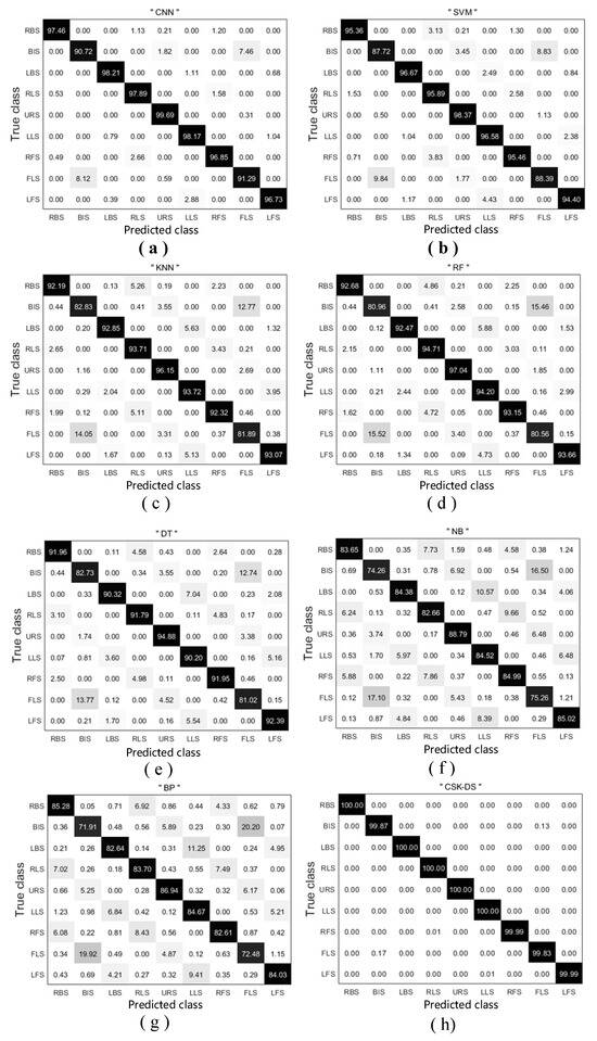 Confusion matrix of each classifier on subject F: (a) CNN; (b) support vector machine; (c) k-nearest neighbor classifier; (d) random forest classifier; (e) decision tree classifier; (f) naive Bayes classifier; (g) backpropagation neural network; (h) D–S fusion method.