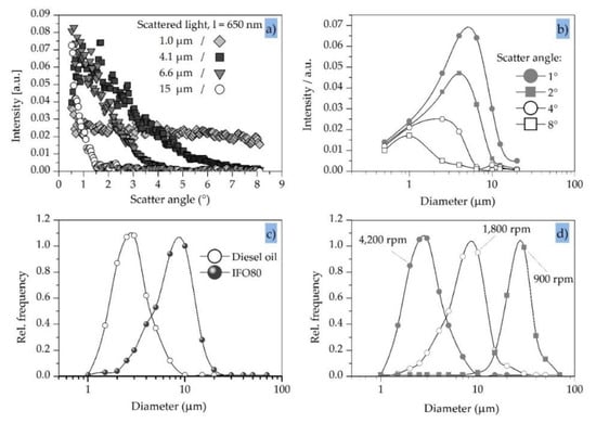 Characteristics of scattered light detection using model particles/droplets. (a) Typical scatter pattern using monodisperse particles made of polystyrene/IF080 (sticky crude oil). (b) Sensitivity of specific scatter angles to different particle diameters (λ = 650 nm). (c) Droplet size distribution using a three-stage rotational pump at different revolution speeds. (d) Droplet size distribution in diesel oil using a three-stage rotational pump for two different oil types.