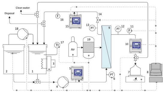 Schematic representation of the semi-automatic crossflow filtration unit: (1 + 2) feed tanks; (3) heading element; (4 + 18) pumps; (5 + 10 + 15) oil-in-water sensors; (6 + 12 + 13) pressure transducers; (7) balance; (8) automation and process control system; (9) ceramic membrane module; (11 + 16 + 20) flow meters; (14) valve; (17) temperature transducer; (19) back flush tank.