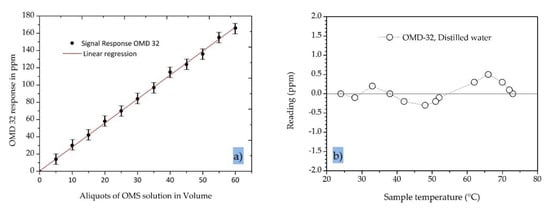 The results recorded by the OMD-32 sensor with the modified/extended measurement range are shown in Figure 6a. In all experiments, we observed a strong linear correlation between the oil concentration and the sensor signal output (R2 = 0.999). The standard error was ±1.9 ppm, indicating that the device can accurately determine the residual oil contamination in the range 0–200 ppm. The standard error of 0.6 ppm for the OMD-32 sensor is far better than the 5.0 ppm specified in the IMO regulations for 15 ppm bilge alarms.