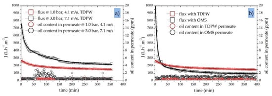 Figure 7a shows the decline in permeate flux and the resulting permeate oil concentrations for a 40 nm UF membrane during the treatment of an OMS with an initial oil concentration of 30 ppm. We tested the effect of two different CFVs (4.1 and 7.1 m·s−1) at a constant TMP of 2.0 bar in fed-batch mode and observed different trends in the decline of permeation flux and oil rejection during the first 150 min. This probably reflects the initial formation of a variable fouling layer composed of oil droplets on the membrane surface []. During the first 150 min, the permeate flux declined by 75% (from 878 to 223 L·h−1·m−2) at a CFV of 4.1 m·s−1 and by 65% (from 1085 to 390 L·h−1·m−2) at a CFV of 7.1 m·s−1. Subsequently, the flux declined at a slow and steady rate in both experiments. If the permeation flux trends are considered for the total duration of the filtration experiment rather than a limited running time, the CFV shows an even more significant positive influence on membrane performance. The average membrane permeate flux over the entire duration of the filtration experiment (350 min) was 361 L·h−1·m−2 for a CFV of 7.1 m·s−1, which is ~50% higher than the 244 L·h−1·m−2 observed at a CFV of 4.1 m·s−1 [].