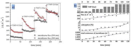 Figure 9a shows the effect of gradually increasing the TMP (from 0.5 to 2.0 bar) on the permeation flux of two SiC MF membranes with molecular weight cut-off values of 200 and 500 nm. The total recycle mode experiments with an OMS (initial Coil = 100 ppm) were carried out at a constant CFV of 1.0 m·s−1 and a process temperature of 40 °C. Initially, the flux through both MF membranes increased with the increase in TMP, consistent with earlier reports concerning the treatment of oily wastewater with ceramic MF membranes [,]. However, a decrease in permeate flux was observed over the duration of the filtration (1 h) at both TMPs, which is the main challenge limiting the practical applications of MF in oily wastewater treatment []. The decrease in membrane flux may vary depending on the process and feed conditions, membrane material, and pore size. Figure 9a also indicates that the higher TMP of 0.5 bar caused fouling to occur more rapidly during each filtration run while significantly reducing the permeation rate of the fouled membrane. However, the increase in permeate flux at TMPs >1.0 bar was not linear, in agreement with an earlier study []. Higher TMPs cause oil droplets to pass through the membrane pores, thus more oil droplets accumulate on the membrane surface and in the pores, leading to a higher fouling rate []. Membrane fouling was more severe at the larger pore size of 500 nm (Figure 9a).