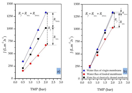 The membrane-fouling resistance (was determined by measuring the pure water flux of the membrane after filtration and after rinsing the membrane with pure water to remove any residual particles from the surface. We then subtracted the resistance of the clean membrane []. Equation (3) can be expanded as shown in Equation (6):
