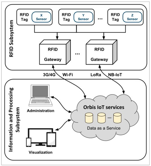 The Orbis Traceability System is divided into two main subsystems: the RFID subsystem and the information and processing subsystem (Figure 1). The RFID subsystem implements RFID technology in the physical layer, querying information from the RFID tags provided with sensing capabilities, called smart-Tags. This data is sent to the cloud using gateways able to implement different telecommunication technologies, in this case RFID, Wi-Fi, and the mobile telephone network. The information and processing subsystem follows the concept of Data as a Service (DaaS) [41], where the stored data available on the cloud are then extracted and processed by an application that serves as a graphical user interface for all the stakeholders involved in the cold-chain monitoring case explained later.