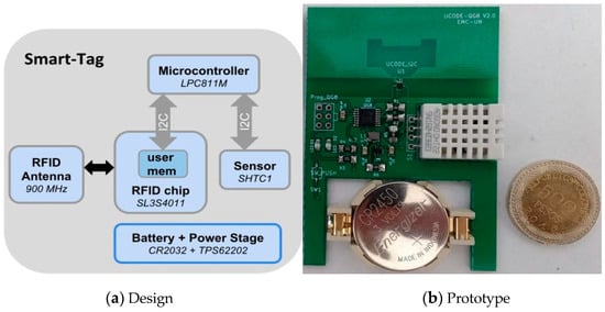 Figure 3 presents the architecture of the smart-Tag developed for this project and its main hardware components. It is mainly composed of the RFID chip, a microcontroller, the specific sensor and the necessary electronics. This device was called smart-Tag because it goes beyond a simple wireless identification label, as it smartly saves sensing information into the user memory of the RFID chip. This means that any ISO 18000-6C compatible RFID reader can gather the information. However, due to its power-saving and economical features, it is a pretty constrained device that does not have much memory, so that the management of information is a key point for implementing this device successfully. Its development was made possible thanks to a versatile chip, provided by the NXP electronics company [48], that besides RFID implements Inter-Integrated Circuit (I2C) communications, allowing the integration of many sensors and electronics into the label. The microcontroller is a low-power device able to extract the information from the specific sensor (temperature and humidity sensor SHT1x from Sensirion). The battery and all the components were selected based on mass production criteria, seeking to achieve low-cost, reliability and scalability, enabling these devices to be integrated in any monitoring and tracking application, looking for small companies to finally invest in a cost-effective technological solution. Assuming that only temperature measurement is required, the mass production cost of this smart-Tag should be less than 2 Eur.