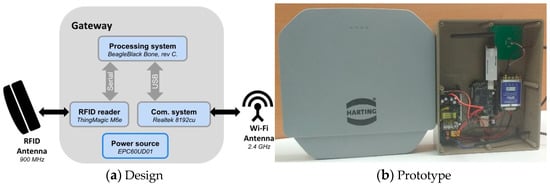 Figure 4 shows the architecture of the gateway and its main hardware components. The gateway implements RFID, Wi-Fi, and mobile network technologies to enable the communication between the smart-Tags and the IoT platform. It uses a commercial RFID reader for gathering the information from the labels, and through the processing system it extracts, encapsulates and sends the information to the IoT platform, making use of the available Internet network. The ThingMagic M6e RFID reader is a small and versatile device that enables the gateway communication with standard ISO 18000-6C RFID labels. It also has an open application programming interface (API) that abstracts all the low level reader protocol (LLRP) functions. This API is implemented in the processing system (BeagleBlack Bone) to query all the information from the RFID tags. The processing system executes an embedded distribution of Linux, which allows fast integration with many hardware communication subsystems used in IoT deployments such as, GPRS radio, LoRa devices, Wi-Fi, Bluetooth, etc. In this case, a Wi-Fi USB dongle device was used, taking advantage of the available wireless local area network.