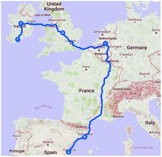 The second case study was carried out by monitoring the temperature of a box of oranges sent from Valencia (Spain) to Cork (Ireland). Figure 6 shows the route traveled by this product, which lasted 8.8 days.