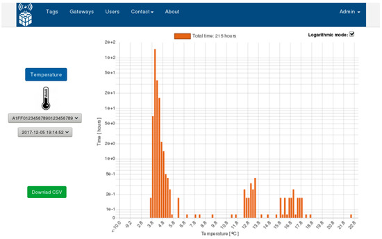 The extracted information is processed by the gateway and sent to the IoT system, registering arrival time and storing conditions. These data are stored in the cloud where through the DaaS middleware it can be accessed at any time. In this case, a third-party application was designed (Figure 7) in order to show times and temperature-storing information during the four stages, where the data are also available for downloading in comma-separated values (CSV) format for further custom analysis. To validate the temperature monitoring operation, we added a calibrated Testo 174H data logger in all of the experiment phases.