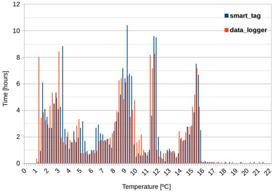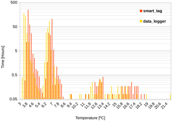 Figure 8, with the Y axis in logarithmic scale, shows the results of both, measurements recorded by the datalogger and measurements extracted from the smart-Tag. Every bar in the graph represents the time that the devices have been exposed to a given temperature range. Although measurements in both devices are distributed following the same pattern, differences can be appreciated in the peaks, typically lower than ±0.5 °C, which is in fact the accuracy guaranteed for both sensors in its datasheets.