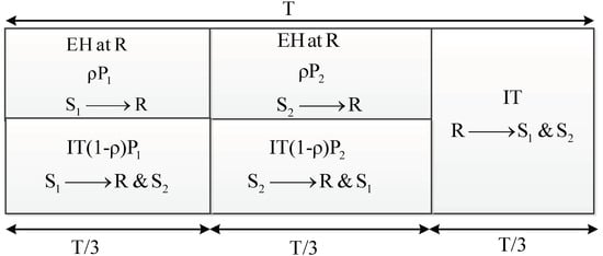 In this section, the energy harvesting based two-way half-duplex relaying sensor cooperative network is drawn in Figure 1. In this system model, sources are denoted as S1 and S2, and the relay is R. We assume that all links between them are available and are block Rayleigh fading channels. The EH and information transformation (IT) for this proposed model system are illustrated in Figure 2. In this protocol, the transmission is divided into blocks of length T, which consists of three-time slots. In the first time slot T/3, the R harvests energy ρP1 from the source node S1, and the source uses the energy (1−ρ)P1 for information transmission to R and S2 (here : is the power splitting factor). In the second interval time T/3, the R harvests energy ρP2 from the source node S2, and the source S2 uses the energy (1−ρ)P2 for information transmission to R and S1. Finally, the remaining time slot T/3 is used for information transferring from the R to the source nodes S1 and S2 [30,31,32,33,34,35].