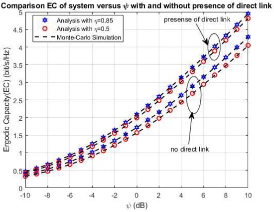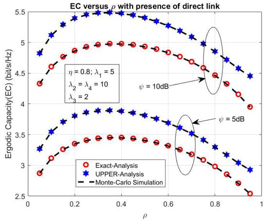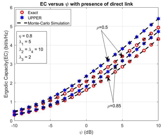 In this section, we investigate the impact of ψ on the system performance of the proposed system in cases with and without the direct link between the S1 and S2 nodes. The Figure 3 shows the system EC versus ψ in the presence of the direct link between the S1 and S2 sources. In Figure 3, we set some primary system parameters as η = 0.8, λ1 = 5, λ2 = λ4 = 10, λ3 = 2, ρ = 0.5, and 0.85. In this simulation, we consider both the exact and upper bond EC in the influence of ψ as shown in Figure 3. From Figure 3, we can state that both the exact and upper bond system EC rise while we vary ψ from 10 dB to 10 dB and the exact EC is higher than the upper bond system EC with all ψ values. Moreover, the analytical expression of the exact and upper bond system EC in the above section is verified by the simulation results using Monte Carlo Simulation. Furthermore, the comparison system EC in cases with and without a direct link between the sources S1 and S2 is illustrated in Figure 4 with the primary system parameters as η = 0.5 and 0.85, respectively. In the same way with the above case, the system EC significantly increases with rising ψ from 10 dB to 10 dB in both cases with and without a direct link between the sources S1 and S2 as in Figure 4. In addition, the system EC in the case with a direct link is better than in the case without a direct link between two sources. It can be observed that the direct link can lead to more useful information transmission in the proposed system. In the model system with the direct link, system has two way to transfer the information as via helping relay and direct link. With two way of information transmission via relay and direct link, this case is effective in information transferring in comparison with the case only with helping of the relay as in [45]. Further, the analytical and the simulation results match well for all possible values of ψ as shown in Figure 4.