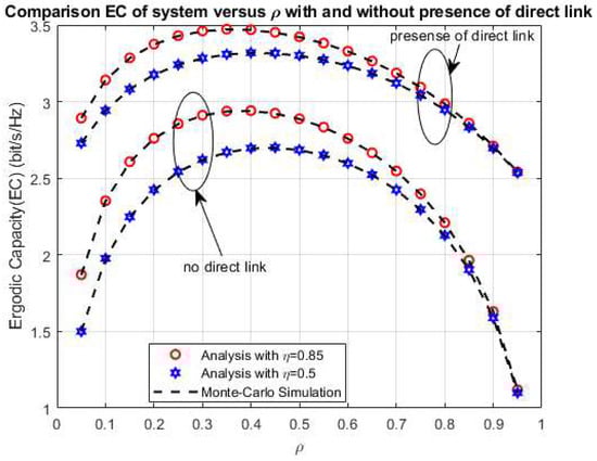 Furthermore, the comparison of the system EC of the cases with and without a direct link between the sources S1 and S2 is drawn in Figure 6 with η = 0.5 and 0.85, respectively. As shown in Figure 6, the system EC in the case with the presence of the direct link is better than the case without in connection with the better information and energy transmission processes with the direct link between the sources. In both Figure 5 and Figure 6, the simulation and the analytical values are the same with all values of ρ to confirm the analytical analysis in the above section.
