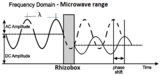 Diagram with the basic principle of the electromagnetic wave interactions with a rhizobox filled by a porous medium (attenuation and phase shift; modified from [11]).