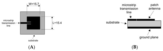 The antennas used in this experiment were designed as λ/2-resonant microstrip antennas (MSAs) [8,10] and executed on a circuit board (glass-reinforced epoxy laminate; FR-4) with 1.5 mm thickness and dielectric constant, εr of 4.4. Although each antenna has a patch of 15.7 mm wide and 15.4 mm long, the total size was 25.0 × 25.0 × 1.5 mm3. Such a design allows one to have effective operation at frequencies close to 4.8 GHz. Figure 3 illustrates our microstrip antenna design for microwave range [8,14].