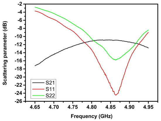 The dependence of the scattering parameters on the frequency for the MSAs was obtained under the standard laboratory atmospheric conditions (Figure 4). The spectrum was measured in the frequency range between 4.650 and 4.950 GHz with a sweep of 1 MHz. For the 24 mm distance between antennas, the obtained resonant frequency f0 was around 4.864 GHz and the magnitudes of S21, S11 and S22 at f0 were −10.868 dB, −24.486 dB and −15.824 dB, respectively.