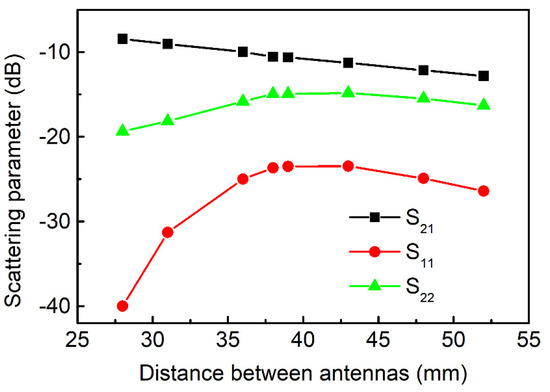 Additionally to that, the antennas were evaluated by measuring the scattering parameters depending on the distance between the antennas. Figure 5 shows S21 (black squares), S11 (red dots) and S22 (green triangles) versus the variation of the distance. The measurements were performed at peak frequencies (since the antennas are resonant), i.e., the shallowest points for S22 and S11, and the highest ones for S21 on the spectra. All frequencies were close to 4.8 GHz. The obtained weak linear dependence of S21 on the distance (about −0.18 dB/mm) reflects the possibility of measurements without the strong control of the distance between sensors.