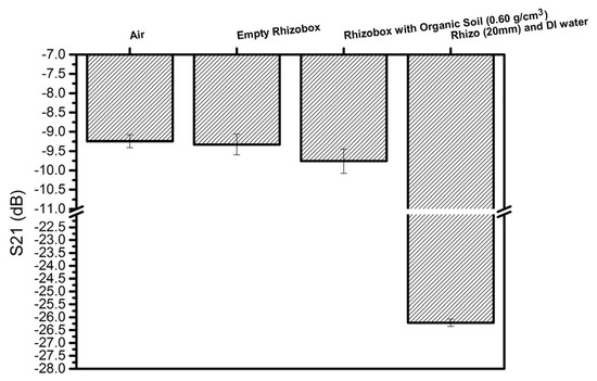 The purpose of this experiment was to observe the variation of the attenuation of the S21 parameter under the influence of lab air condition, using an empty rhizobox and a rhizobox filled with one porous media (PM; Nullerde organic substrate with one density from dry soil) as well as with DI water. Figure 6 shows the bar graph of S21 for the samples that were used. The measurements were taken three times for each sample. The attenuation in the case of DI water was very strong giving S21 to be about 26.5 dB, the other samples had S21-values close to 9.7 dB. The measured data show a correlation between S21 and the dielectric constant of each material, as εr was changed from 1 (air), to εr < 5.0 for PMMA/PVC and PM and to 78 for water.