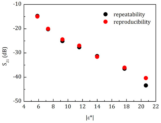 This experiment aimed to correlate the dielectric permittivity of certain concentrations of organic chemical solutions (see Table 1, in this case mainly 2-Isopropoxyalcohol) with the peak values of S21. The results clearly show a correlation between the two variables reflecting that when the dielectric permittivity increases, the attenuation also increases. Figure 7 exhibits the experiment emulating the value of the dielectric constant in water, in terms of repeatability regarding the equipment used. The values presented the average of S21 () = S21(i) ± STD S21 for both measured (reproducibility and repeatability) parameters demonstrate the degree of variation with which the obtained results can be regarded, concerning the experimental system that has been developed. (Supplementary Materials (SM): Figure S1A–D are showing the dependences of S21 on different parameters, as (A) tanδ X S21 (dB); (B) |ε*| X S21 (dB); (C) ε′ X S21 (dB) and (D) ε″ X S21 (dB)).