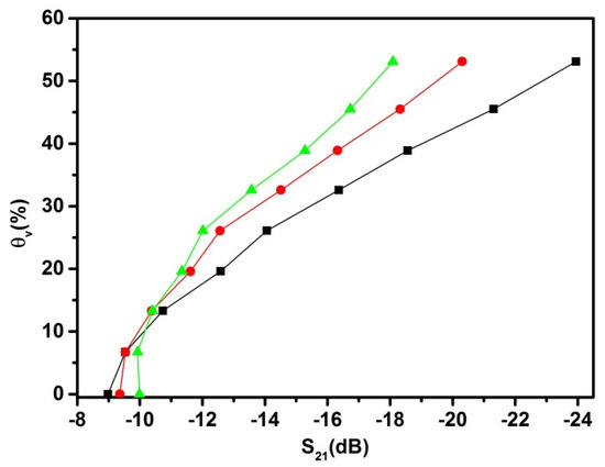 Influence of temperature on the θV measurements using attenuation S21. The porous medium used was Nullerde, and the temperature set up for this experiment was 13.0 ± 0.5 (black squares), 26 ± 0.5 °C (red dots) and 39.0 ± 0.5 °C (green triangles).