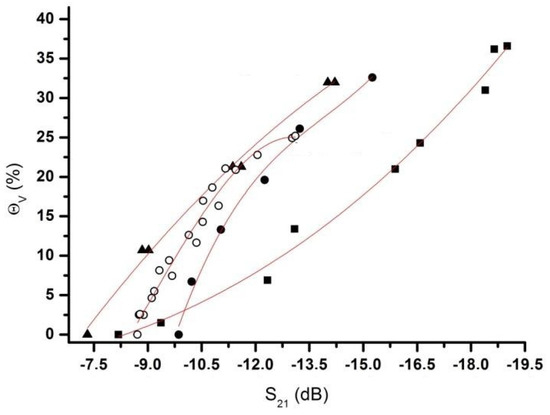 Relationship between the S21 measured with the developed system and the volumetric soil moisture θV determined and calculated by the second and third order polynomial equation. The equations are presented in Table 3. The four (04) samples used are Cerrado Soil (squares), Nullerde (dots), Kaktus Soil (open circles) and Glass Beads (triangles). The experiment was carried out at standard laboratory ambient conditions (Temperature (T(°C)) = 25.0 ± 0.5 °C and Relative Humidity (RH(%)) ≅ 30%).