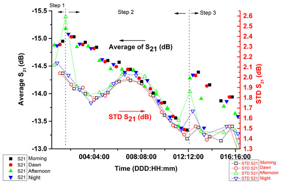 The volumetric soil moisture θV decreased with time, from 34.5% to 27.2%. The range of the data were collected after 1 day, 15 h and 17 min until 12 days, 9 h and 11 min from the experiment running, and were showing the increase of attenuation measuring the S21(i), calculated the and STD S21. Table 4 presents a specific region from Figure 8 that shows an inversion behavior of average (dB) and used the absolute value of the STD S21 (dB).