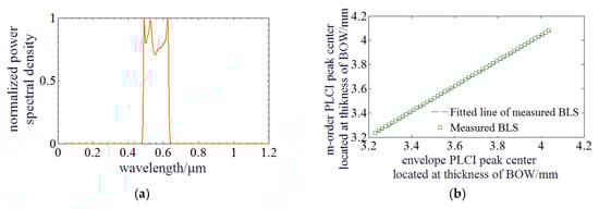 The zero-order PLCIF peak center can be determined by this linear relationship and then polynomial fitting is conducted to improve its sensing accuracy. Next, this method is discussed with a BLS of non-uniform profile. The BLS is a supercontinuum source SC-PRO-M produced by YSL Photonics (Wuhan, China). It has a broadband spectrum ranging from 400 nm to 2400 nm. Lowpass and highpass optical filters are utilized to achieve a broadband spectrum centered at 560 nm of a ~150 nm bandwidth. Its spectrum is measured as illustrated in Figure 5a. Then, this BLS of non-Gauss profile is used to run the simulation and verified the availability of the proposed method. Figure 5b,c illustrate that the zero-order PLCIF peak center shifts with the envelope center and they also represent a good linear relationship. The function parameters are p = 1.0450 and q = −0.1380 which is slightly different from these of BLS in Gauss profile. The linear fitting residuals are ~0.141 mm.