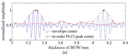 Due to the dispersion of BOW, the center of envelope and the m-order PLCI peak would be not overlapped anymore. By Equation (9), the envelope center hc can be derived when the exponential term is zero, and the m-order PLCI peak hm can be derived when the cosine term is 2mπ. So, hc and hm can be expressed as follows: